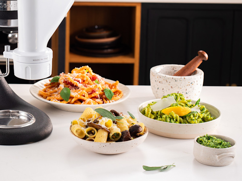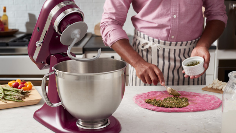 Montar merengues esponjosos, desmenuzar el pollo, prensar la pasta, amasar el pan, picar hielo, trocear verduras… La batidora amasadora KitchenAid puede encargarse prácticamente cualquier tarea en la cocina. Lo único que no puede hacer es decidir cuál de estas deliciosas 41 recetas preparar. Si estás buscando una receta concreta, por ejemplo, un brioche suave y esponjoso, pasta casera o el helado de vainilla definitivo, o si solo tienes curiosidad por ver lo que puede hacer tu batidora amasadora, con los accesorios adecuados podrás cocinar todos los platos de esta lista con facilidad.