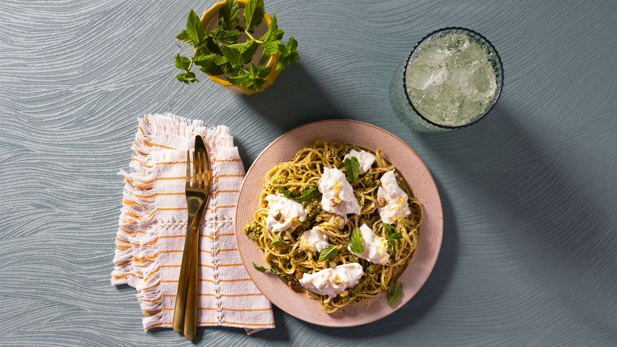 Hierve la pasta durante 6-7 minutos. Escúrrela, añade el pesto y remueve la mezcla. Sírvela con burrata y decórala con ralladura de limón, menta y pistachos.